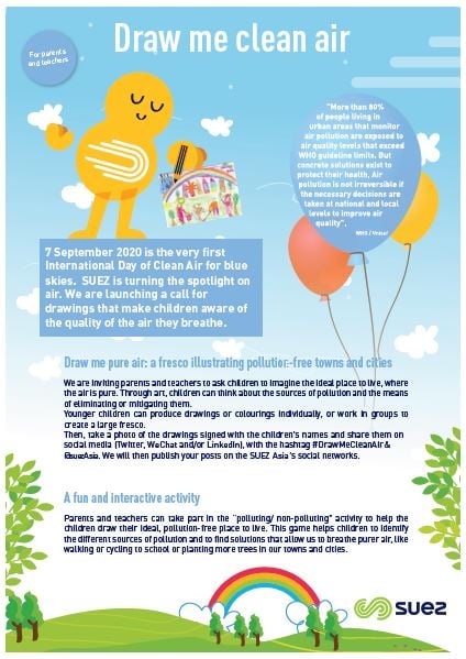 Children can produce drawings individually or in groups creating a large fresco. Parents or teachers can then take a photo of the drawings signed with the children's names and share them on social media (Twitter, WeChat and/or LinkedIn), with the hashtag #DrawMeCleanAir and @suezAsia! We will share the posts on SUEZ Asia’s social media.