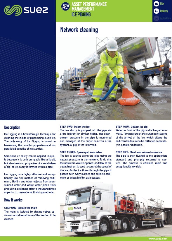 Efficient cleaning of potable water supply networks through Ice PiggingTM, a non-invasive and low risk technique that minimizes disruption and downtime to customers. We provide a turnkey process of mains cleaning from planning and simulation of the interventions, to water quality testing and customer service.