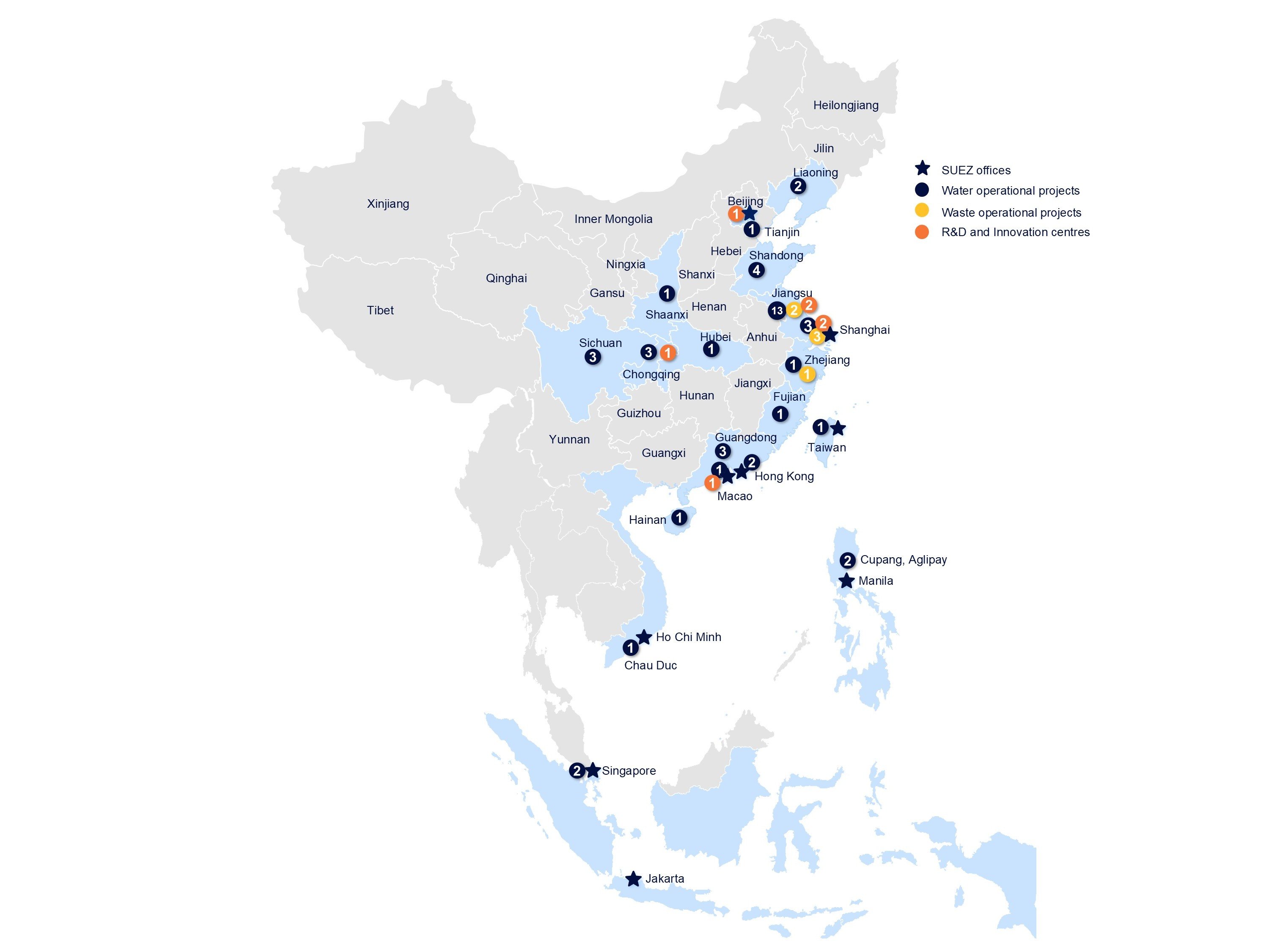 In Asia, SUEZ’s journey began some 70 years ago, first in Southeast Asia before expanding to China nearly 50 years ago. With 6,500+ employees across Asia, SUEZ has built over 600 water and wastewater treatment plants. Together with our local partners, we also manage over 40 contracts, providing water and waste recycling and recovery services to 25+ million people and 23 industrial parks across the region.