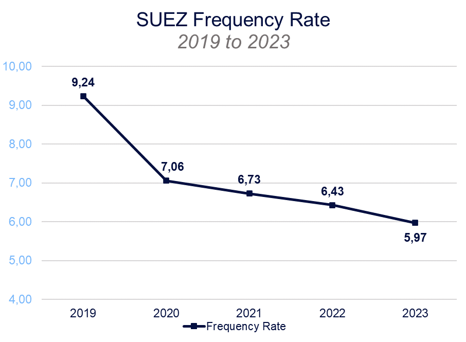 For many years, we have been committed to protecting the health and safety of all our employees and subcontractors as well as the customers and populations among which we work. We are known and recognized for our strong Health and Safety culture. The action plans deployed on all SUEZ sites over the past several years have enabled a continuous reduction of the frequency rate of accidents (60% reduction in 10 years, see diagram below) and a significant decrease in their severity.