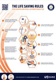 - The "10 rules that save" are the latest individual prevention barriers applicable to all our activities. Anyone who may be exposed to our major risks is regularly trained in these rules which, if followed, save lives. The aim is to raise individual and collective awareness of our most important risks, including with our subcontractors and customers, to change behaviors on a daily basis so that we can work in complete safety. Multi-year actions have been taken to control each major risk in our activities. They are based on the three pillars of an integrated Health & Safety culture (Technical, Management System and Human and Organizational Factors) while implementing innovative solutions.