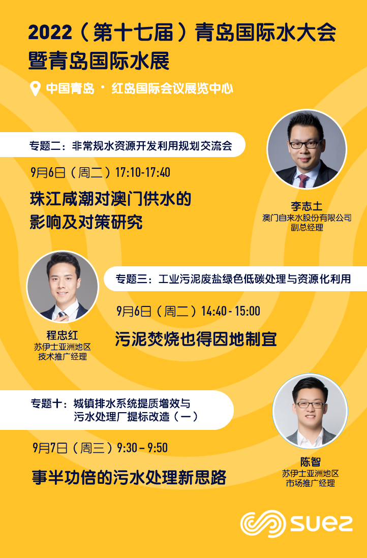 苏伊士将在本次活动上发表3个主题演讲,包括在非常规水资源开发利用规划交流会上就珠江咸潮对澳门供水的影响及对策研究的主题演讲,还有两个专题论坛就污水处理和污泥处置做主题演讲。 -