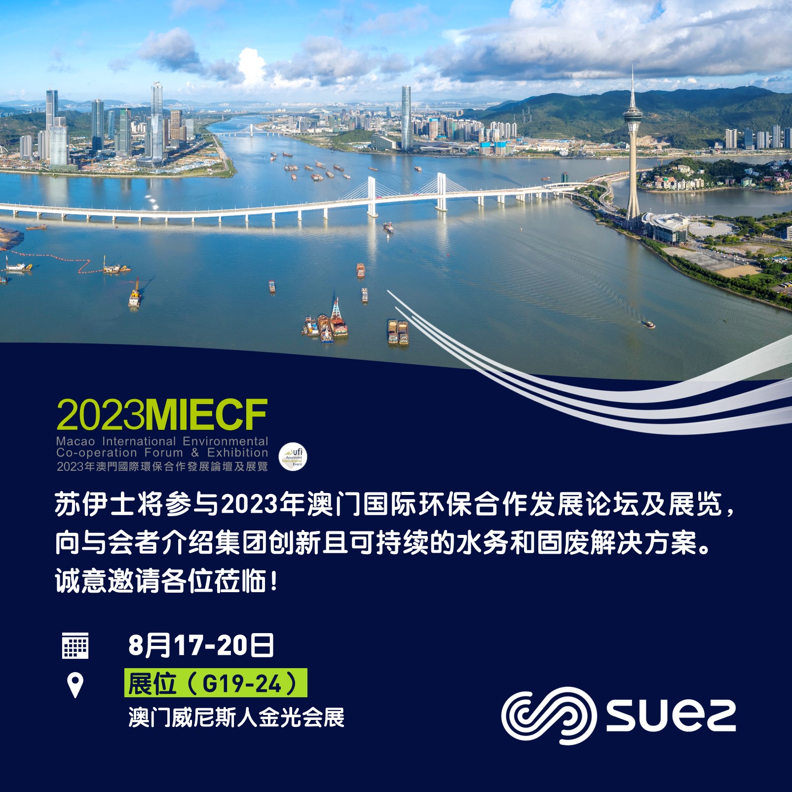 苏伊士展台位于G19-24,与其子公司澳门自来水共同参展,围绕苏伊士在水务以及固废价值链,特别是数字化和智慧管理的创新和可持续解决方案和经验,与与会者一起探讨和交流。
