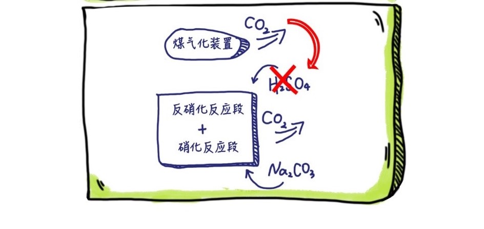 将煤制氢产生的大量CO2引入污水处理过程,作为酸碱调节剂。