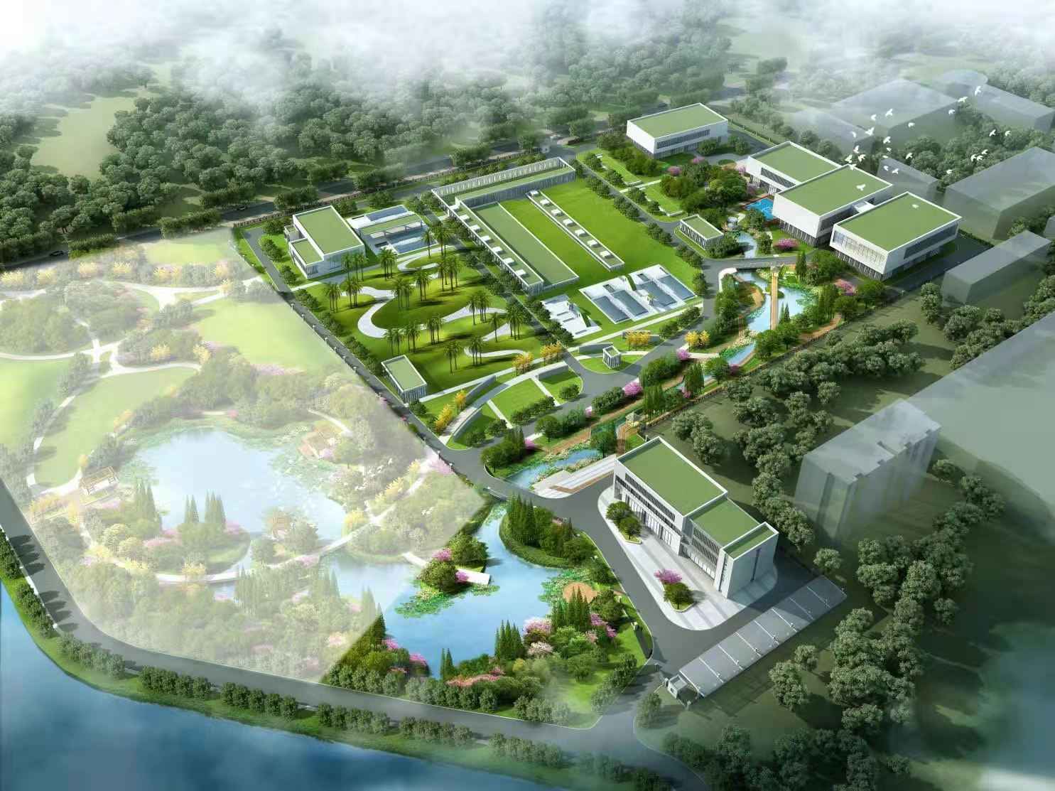 珠海市金湾区红旗水质净化厂3D鸟瞰图,苏伊士为其提供设备供货及相关技术服务。